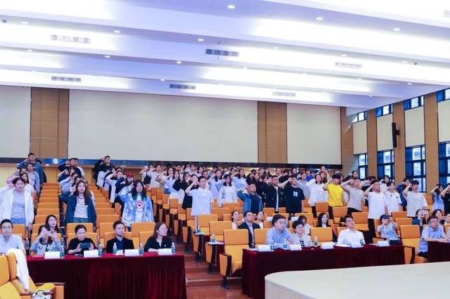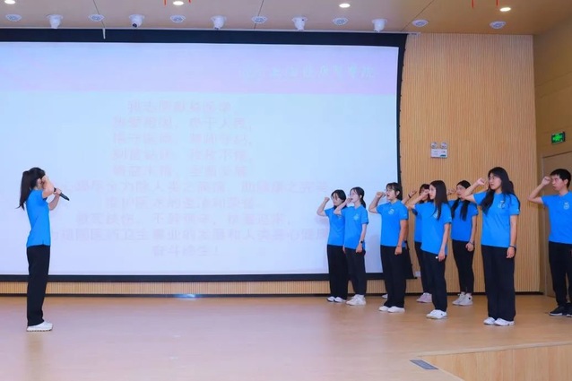 接着,由21级食品卫生与营养学专业的阙红玲同学带领新生们进行医学生誓词宣誓仪式。全体2023级新生举起右手,庄严宣誓:“我志愿献身医学,热爱祖国,忠于人民……”一句句誓词强化了大家对医学生身份角色的归属与认同,也为同学们未来的奋斗目标指引了方向。