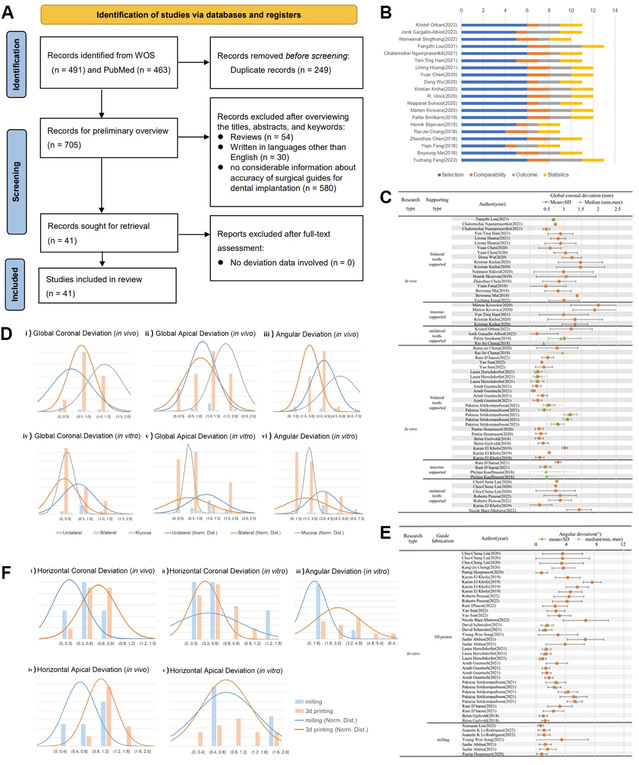 本综述旨在揭示口腔种植导板的支持类型、制造方式和固位针、套筒设计等因素对种植手术精度的影响。通过检索近五年关于口腔种植导板精度的文献并进行筛选纳排,对多项种植导板手术精度数据进行整理归纳、绘制森林图、正态分布统计等分析讨论,最终总结和揭示出不同因素对种植导板手术精度的影响,为未来种植学的发展提供理论依据。