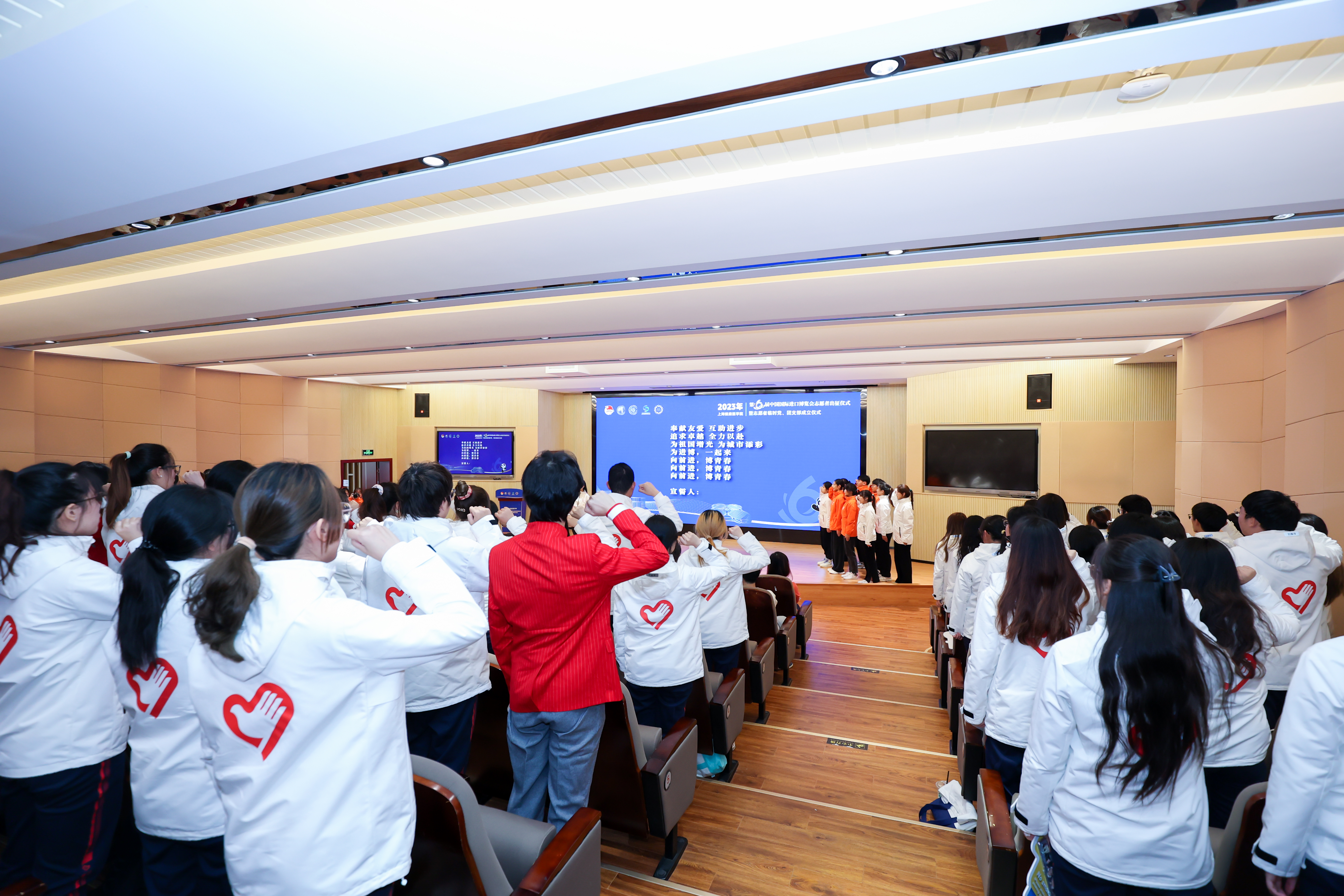 10月26日中午,上海健康医学院第六届中国国际进口博览会志愿者出征仪式暨志愿者临时党、团支部成立仪式在北苑1号楼200人报告厅举行。共青团上海市委员会学校工作部部长、一级调研员、市学联秘书长任浡,上海市卫生健康委员会健康促进处副处长崔元起,共青团上海市卫生健康委员会委员会书记何江江,上海市健康促进中心副主任陈德,上海市卫生健康委员会健康促进处一级主任科员黄智勇,青浦区卫生健康委员会健康促进科科长张薇,青浦区爱国卫生和健康促进指导中心办公室主任汤碧华,校党委副书记、副校长唐红梅,学校相关部门负责人,相关委办局的各位领导嘉宾、学校各学院党团组织负责人,以及140名第六届进博会志愿者出席了本次活动。仪式由校团委(挂职)干部白妞主持。