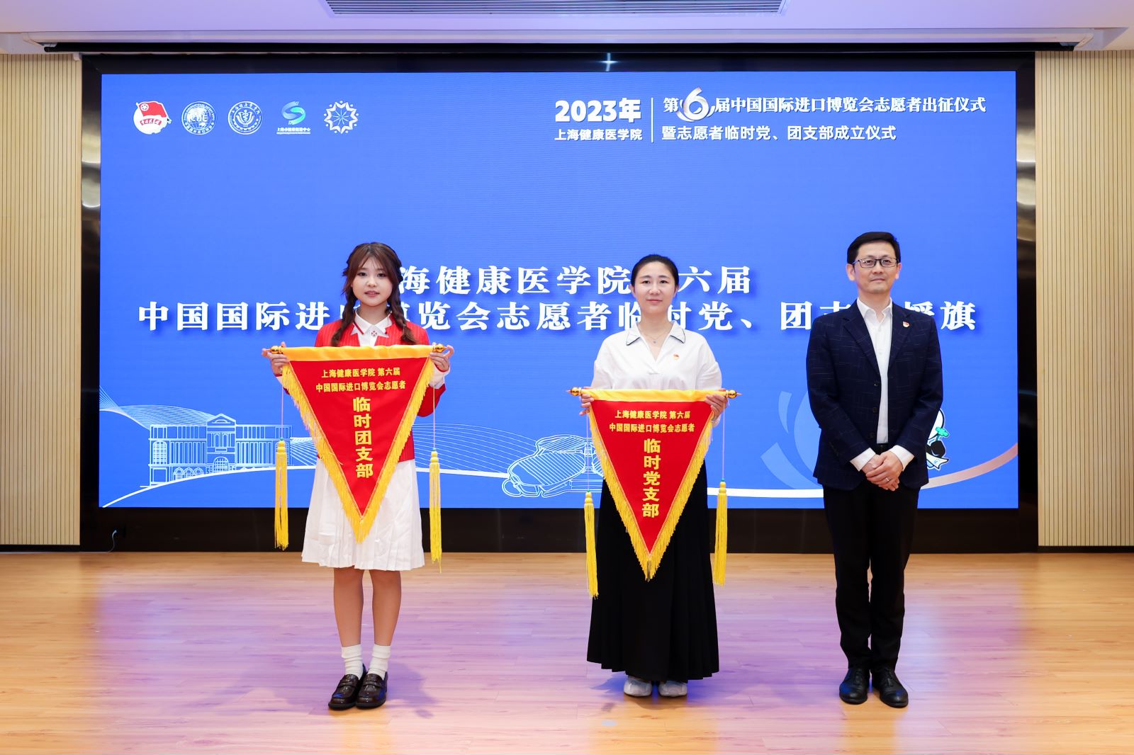 任浡为我校第六届进博会志愿者团队授旗,健康“小叶子”将在服务中茁壮成长,在奋斗中砥砺意志,让青春在建设社会主义现代化强国的新征程中绽放光彩。