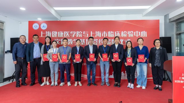 随后,刘敏娟和胡晓波上台签约上海健康医学院教学战略合作框架协议。虞涛、唐红梅、王莉、何智纯共同为上海健康医学院实践教学基地揭牌。南德红和医学技术学院班子成员一起为兼职教授、副教授颁发聘书。