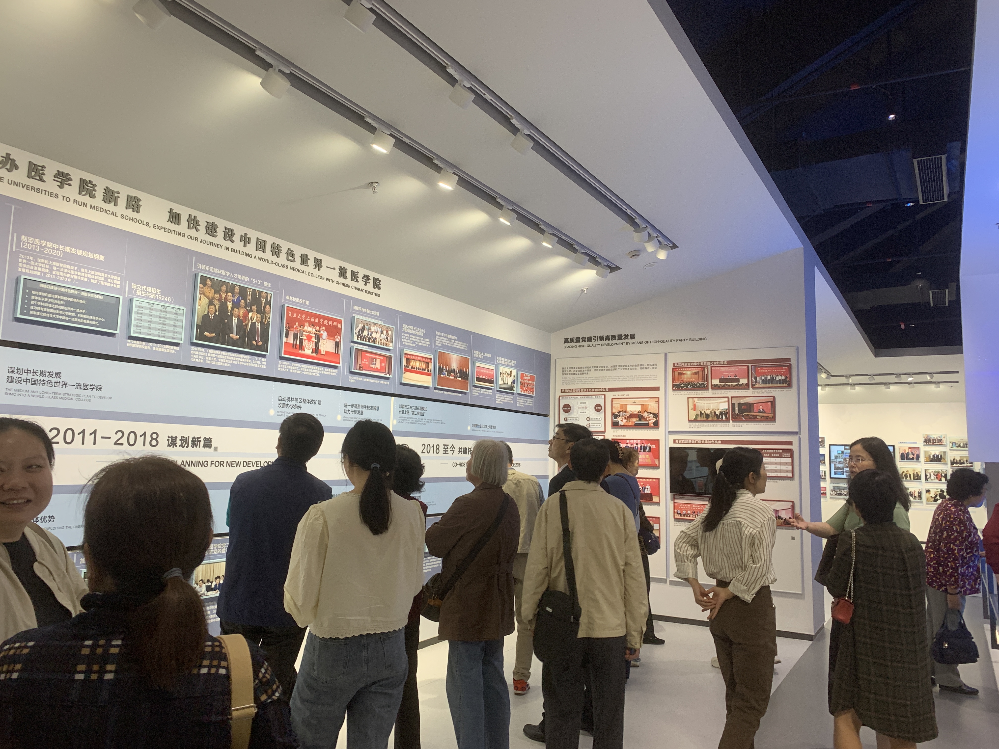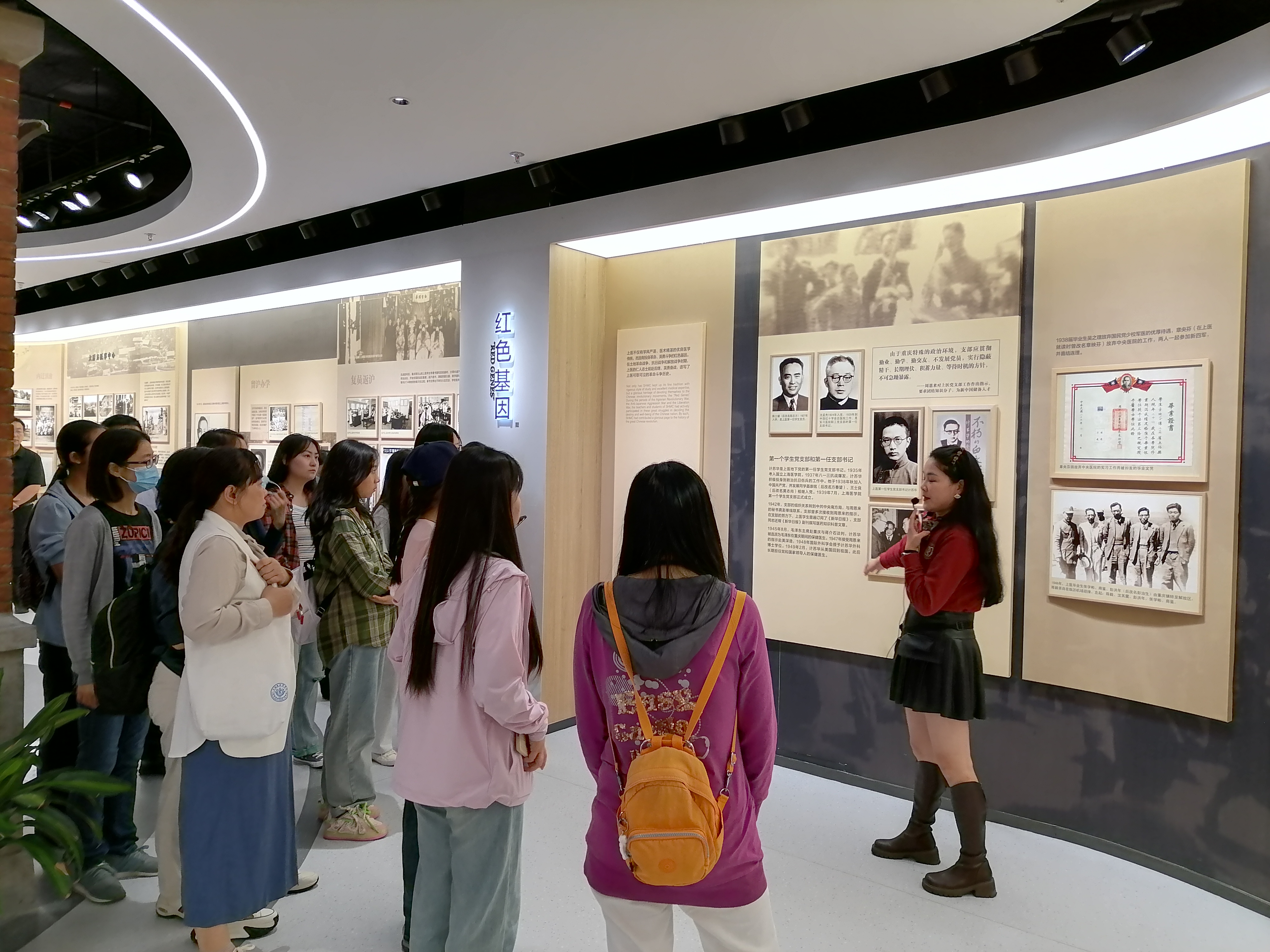 在讲解员的指引下,师生们依次参观了“始创奠基”“探索发展”“改革振兴”“奋进一流”“携手向前进展”5个展厅以及“医学丰碑”“中国共产党人的精神谱系——上医人的身影”2个专题连廊。一帧帧图片、一件件器物、一块块牌匾等珍贵资料,记录了老一辈医者于烽火中艰苦建校,到远迁滇渝、复员返沪,再到曲折办学、接续时代使命的光辉历程,波澜壮阔的历史画卷吸引打动了师生们。