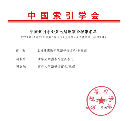 2023年10月21日,中国索引学会第六次全国会员代表大会暨第七届理事会第一次会议在北京国家图书馆召开。会议选举产生了新一届理事会和领导机构。中央党史和文献研究院副院长王全春当选为第七届理事长,研究院一级巡视员许先春当选为常务副理事长兼法定代表人。我校图文信息中心主任彭骏当选理事,这是我校图书馆首次成为国家一级学会理事单位。