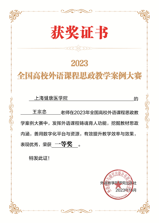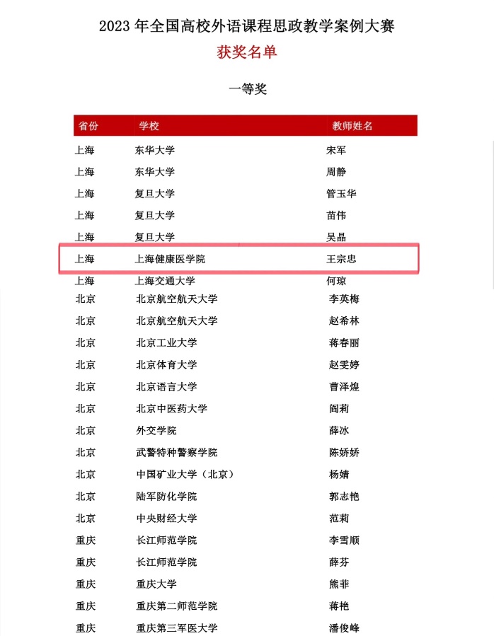 近日,2023年全国高校外语课程思政教学案例大赛获奖名单公布,外语教学部王宗忠老师提交的以医学伦理人文教育为单元主题的医学英语课程思政教学案例荣获全国一等奖!
