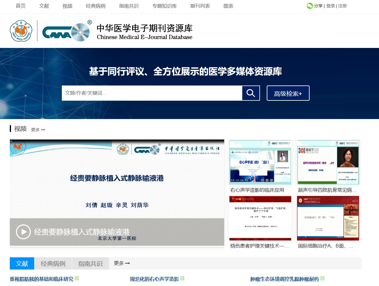 “中华医学电子期刊资源库”是国内首个基于同行评议,通过图、文、声、像全方位展示,集医学视频、学术文献、在线专科教育等医师服务于一体的医学多媒体数据库,包括视频资源库、文献资源库、经典病例库、指南共识库等,并且可以根据机构、读者的需求设置不同的专题知识库。该数据库平台将实现学术资源的富媒体化、移动传播。