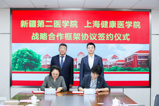 在吴韬和冯述江的共同见证下,于莹、徐培兰签署了《上海健康医学院与新疆第二医学院战略合作框架协议》。
