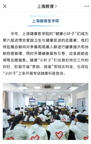 在我们的共同努力下,健康“小叶子”们在第六届进博会中充分发挥作用,为参展人员提供了全方位的服务和支持,以饱满的精神状态守护“无烟进博”!