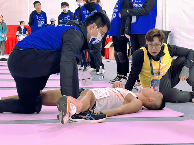 王耀:在拉伸过程中,我们和各个完赛者密切交流,为他们寻找最适合的拉伸力度,也同样作为一个倾听者聆听他们在上马中出现的各种意外,还有感动。一直延伸到他们先前的跑马经历、跑步生涯。作为一个康复学生、也作为一个后辈,学习并了解了很多他们在运动中的损伤和康复,以及他们由跑马而切入生活的感悟,感触颇深。这是我的第一次志愿者经历,也很幸运为上马做出自己的贡献,收益良多。