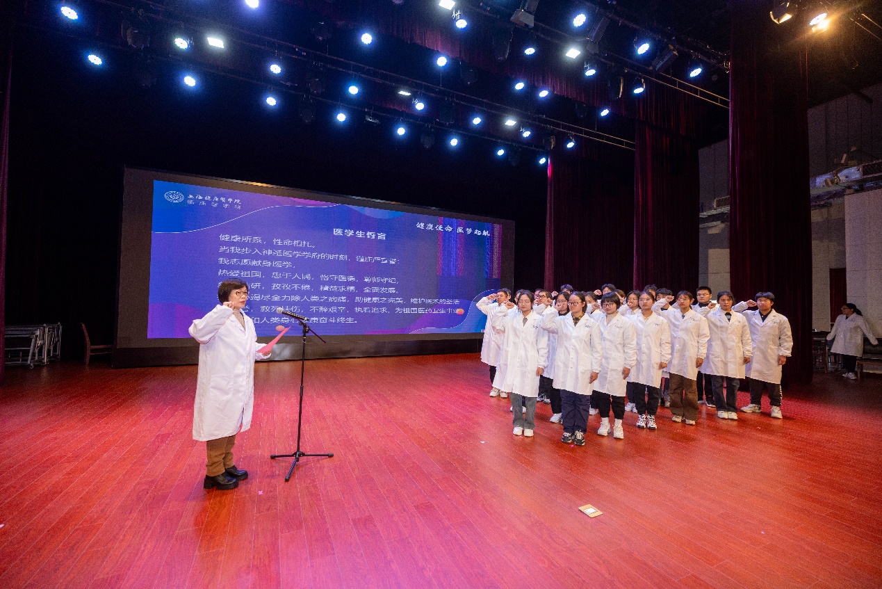11月30日下午,“健康使命·医梦起航”——2023级临床医学生白袍仪式在北苑1号楼400人报告厅隆重举行。校党委书记郭永瑾、临床医学院原院长蔡巧玲、临床医学院常务副院长杨光锐、基础医学院院长杨智昉、附属崇明区中心医院副院长黄鹏、附属奉贤区中心医院副院长孙振亮、附属周浦医院沈艺教授、第六人民医院临港院区谢芳艺教授、附属嘉定区中心医院王飞教授、学工部副部长慈兴强、基础医学院、文理教学部、协同科研中心相关部门老师,临床医学院全体教师、2023级临床医学本专科共计234名学生参加仪式。仪式由临床医学院党总支副书记罗瑾琰主持。
