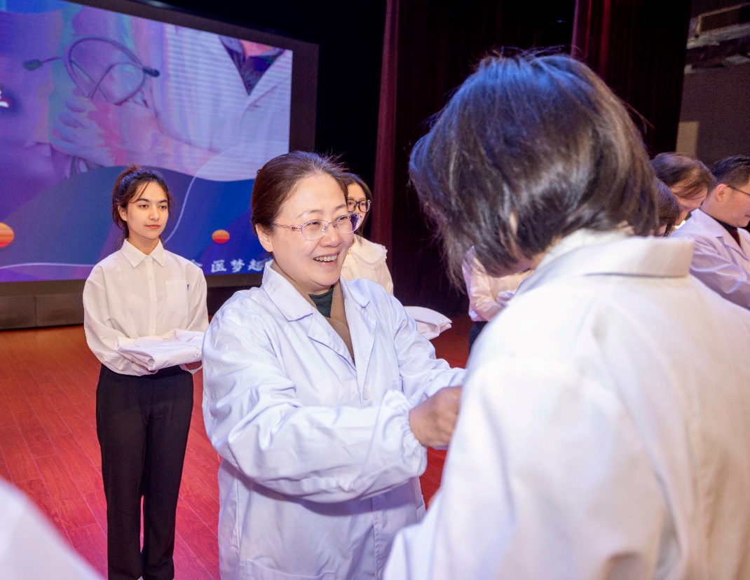在庄严的国歌中,白袍仪式拉开序幕。在授袍仪式环节,郭永瑾、蔡巧玲、杨光锐、杨智昉等11位导师亲自将整洁、神圣的白袍授予医学生代表,并为他们穿上白袍、整理衣扣、送上嘱托。台下,全体医学生在庄重和严肃的气氛中,一起郑重地穿上白袍、整理好衣扣。