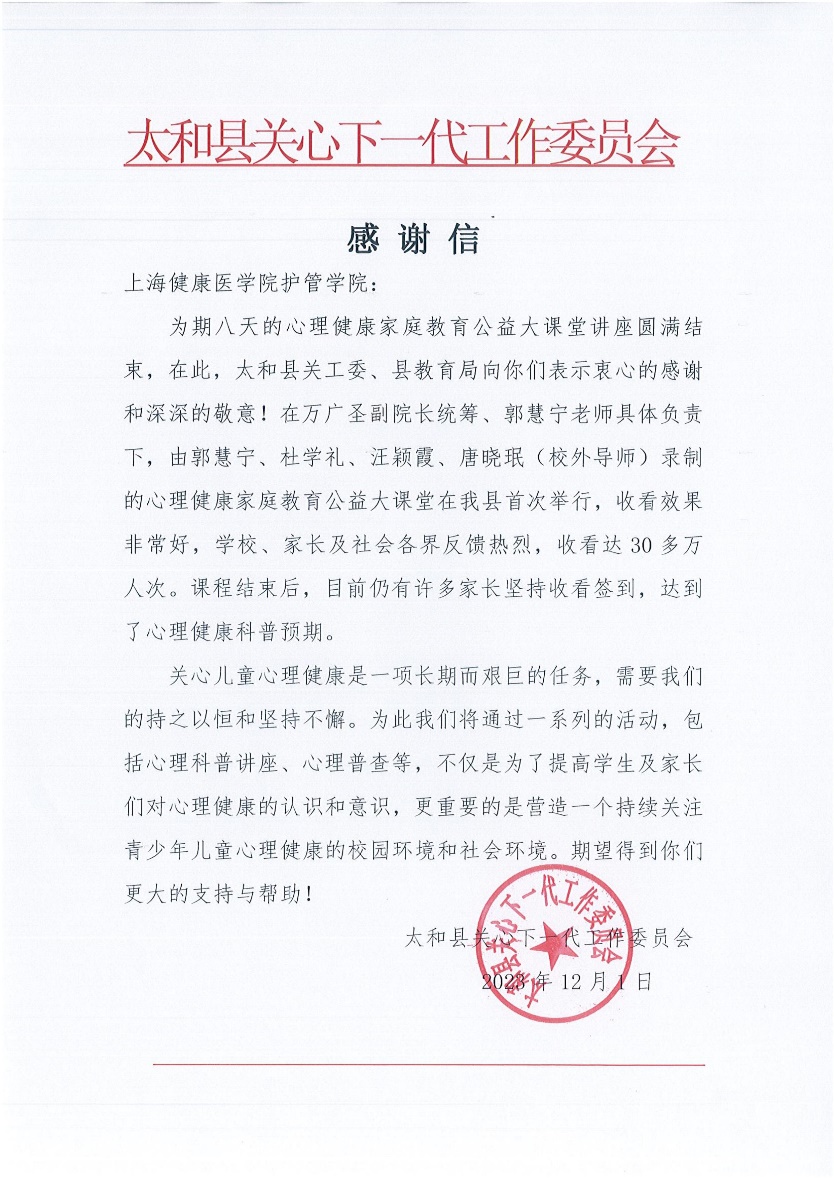 近日,上海健康医学院护理与健康管理学院健康服务与管理专业携手中国校园健康行动领导小组办公室,在安徽省太和县关心下一代工作委员会、太和县教育局的共同组织下,联手举办了一系列线上心理健康家庭教育公益大课堂讲座,在当地反响热烈。