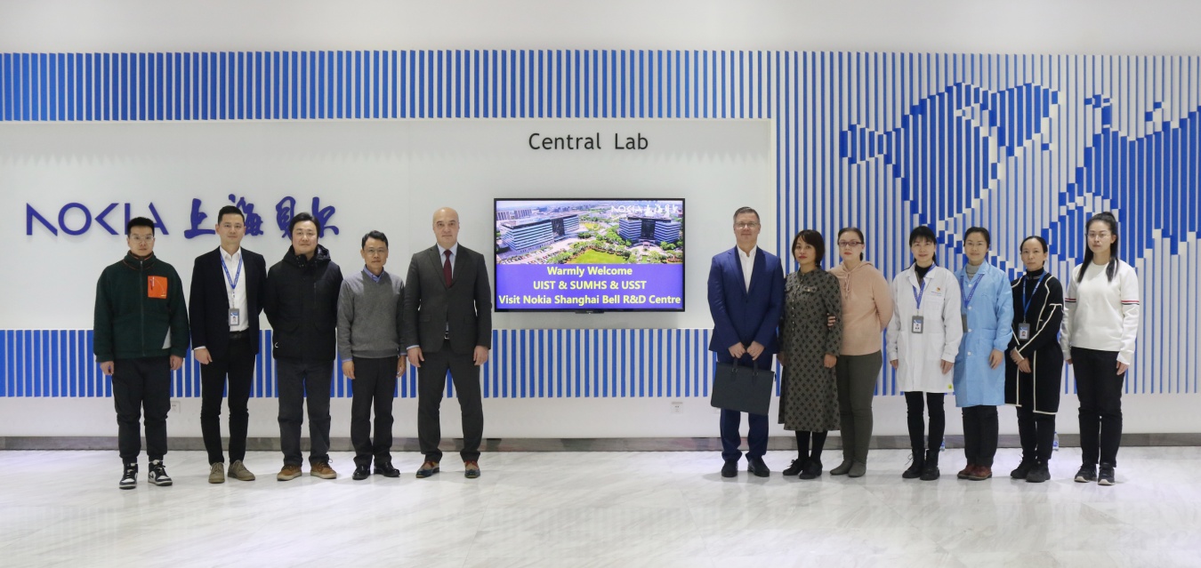 1213日下午,医疗器械学院杨晖院长带队,北马其顿信息科学与技术大学荣誉校长Ninoslav Marina 教授、校长lvan Bimbilovski 教授,上海理工大学光电信息与计算机工程学院秦川教授,学院数据科学与大数据专业李萍主任访问上海诺基亚贝尔实验室NI及学创中心,上海诺基亚贝尔方案架构及网络自动化技术办公室负责人石涛接待了来访人员,双方就AI、区块链、信息安全等主题以及这些前沿技术在智能医疗健康应用、助力赋能医疗数据的共享、安全和高效等方面进行了深入交流。