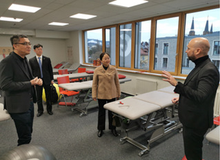 德国访问期间,在德国弗莱堡经济促进署组织下,首先访问了ISBA高等职业大学的康复治疗专业。罗伯特·维特劳尔教授代表学校向代表团介绍了康复治疗学的办学情况及大学的基本情况,带领大家参观了康复治疗学专业的实践教学设施。随后,代表团访问了巴德克洛钦根莱茵河谷康复医院,与莱茵河三国都市区促进署理事长兼欧洲环境基金会理事长贝恩特·达勒曼博士、巴德克洛钦根莱茵河谷康复医院院长亨里克·舒尔茨等进行了交流,重点了解了巴德克洛钦根莱茵河谷康复医院的运营情况、德国康复医院的发展历程、运营管理模式等内容,并探讨未来在康复医生培训、康复医疗质量认证体系评估、护理康复等领域合作内容。