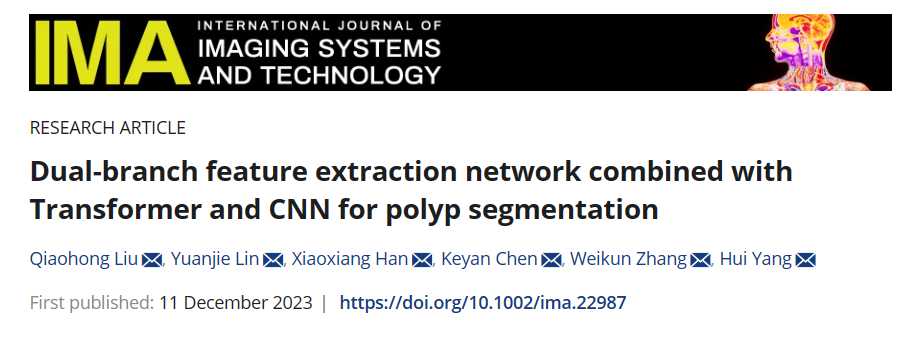 该团队另外一个研究工作“DFETC-Net: Dual-branch feature extraction network combined with Transformer and CNN for polyp segmentation”发表在国际著名期刊《International Journal Of Imaging Systems And Technology》上。该期刊是由WILEY出版,专注于人类和动物影像学的医学研究,包括影像物理学和信息学,为中科院4区期刊,最新影响因子为3.3。刘巧红教授为论文第一作者,林元杰同学为论文第二作者,杨晖教授为论文通讯作者,我校为该论文第一完成单位及通讯单位。
