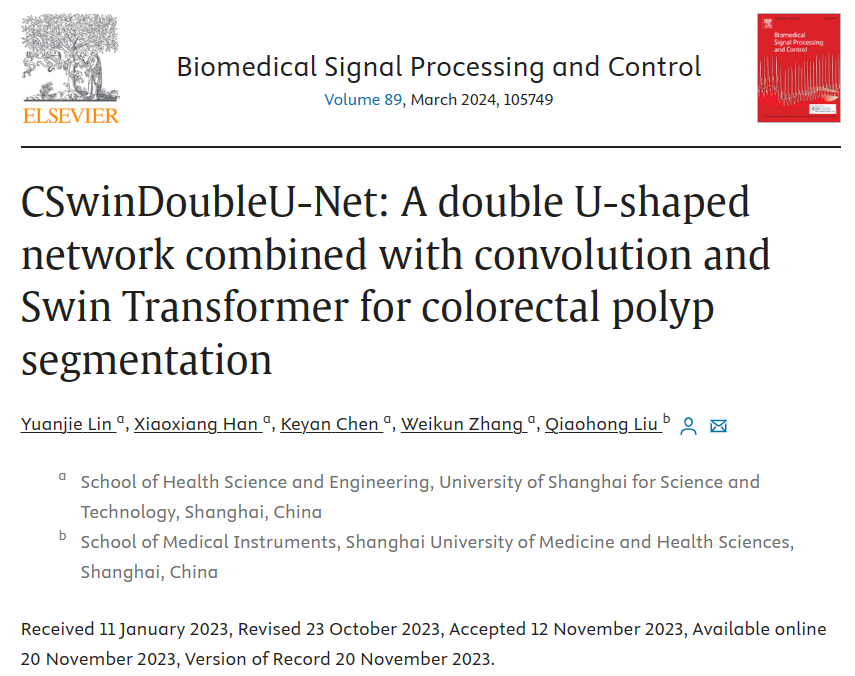 近日,我校智能医疗器械与主动健康协同创新团队的刘巧红教授带领其研究生团队针对结肠镜下的息肉分割问题在国际著名期刊上发表多篇文章。其中,2021级研究生林元杰等人完成的研究工作“CSwinDoubleU-Net: A double U-shaped network combined with convolution and Swin Transformer for colorectal polyp segmentation”在国际著名期刊《Biomedical Signal Processing and Control》上发表。该期刊是由Elsevier出版,专注于临床医学和生物科学中信号与图像的测量与分析研究,为中科院2区期刊,最新影响因子为5.1。林元杰同学为论文第一作者,导师刘巧红教授为通讯作者。