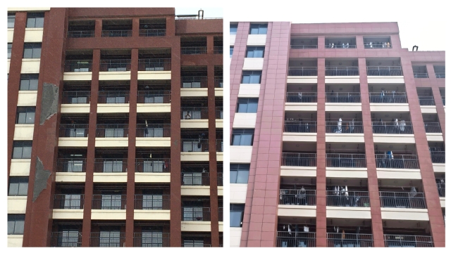 近年来,原新南苑房屋外立面陆续出现不同程度的脱落、空鼓和开裂等现象,对校园内师生的人身安全带来严重威胁。为全面彻底消除安全隐患,基建修缮管理部门主动开展调研,通过查实情、摸实况、寻对策,编制项目申报书和维修方案,经学校研究决定后申请增补入市教委大型维修项目库。在上级部门的大力支持下,经专业评审机构入、出库评审,于2023年1月正式获得项目批复,2023年6月开始实施房屋外立面抢修工程。