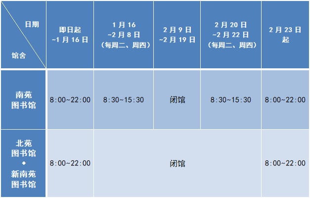 根据学校关于2024年寒假安排的通知,结合图书馆实际情况,寒假期间南苑图书馆对外开放,其他馆舍闭馆。具体开放时间见附表所示:
