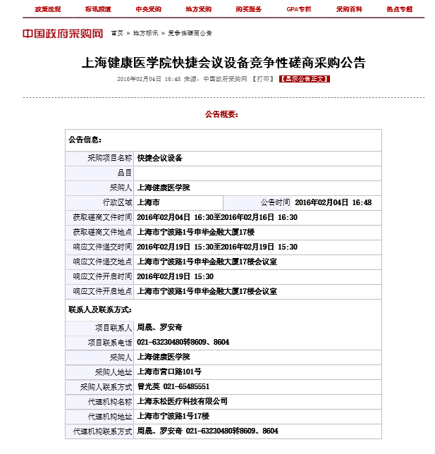 上海健康医学院快捷会议设备招标公告
