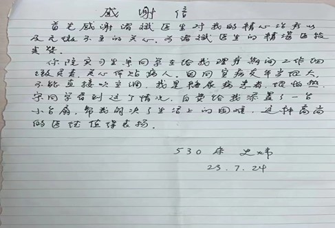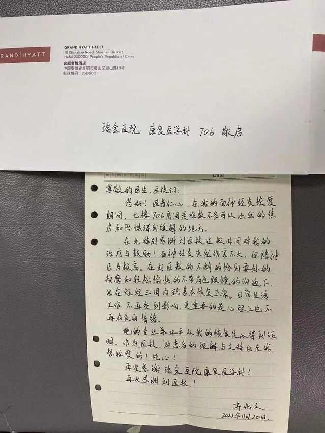 11月,在瑞金医院门诊运动治疗室做康复的患者郭兆文因面神经炎导致精神压力极大。实习生刘佳欣同学在治疗过程中,营造轻松愉快的氛围,缓解病人的紧张情绪,并以专业的技术使得病人在短期内得以康复,收到患者手写感谢信,感谢刘佳欣同学扎实的专业技术和作为一名医者的仁爱之心。