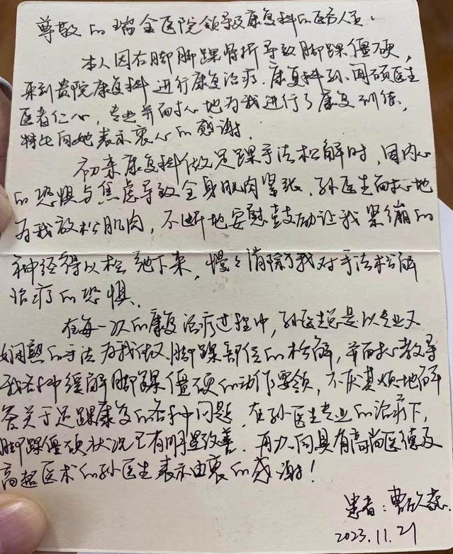 11月,在瑞金医院门诊运动治疗室内,患者曹欣蕊足踝僵硬,活动受限,因对手术治疗的恐惧和焦虑导致全身肌肉紧张。实习生孙闻硕同学在治疗过程中,不断给予暖心安慰,耐心为病患放松肌肉,并以娴熟的手法给予患者足踝松解术,不厌其烦地解答有关足踝康复的各种问题,缓解了患者的焦虑,并很大程度改善患者症状,收到患者手写感谢信以表扬孙闻硕同学高尚的医德及高超的技术。