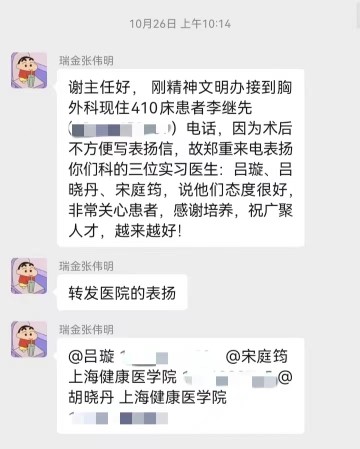 10月,瑞金医院胸外科410床患者李继先致电医院精神文明办,因术后不方便写表扬信,特郑重来电表扬康复科实习医生:吕璇、胡晓丹(图中“吕晓丹”笔误)、宋庭筠,对我校学生的精心呵护和学校、医院的培养表示衷心的感谢,字里行间都是患者的真情流露。