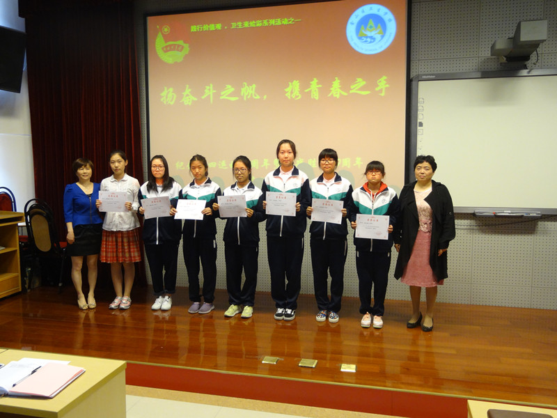 分校领导首先宣读了“2013-2014学年区卫计委团委先进个人”和“2014-2015学年校优秀团干部、优秀团员、优秀志愿者”名单,并向全校团员青年致以亲切的问候和真挚的祝福并希望他们擎起五四的火炬,携着希望起飞,与祖国共奋进,与学校同发展,在人生道路上谱写出一曲曲壮丽的青春之歌!