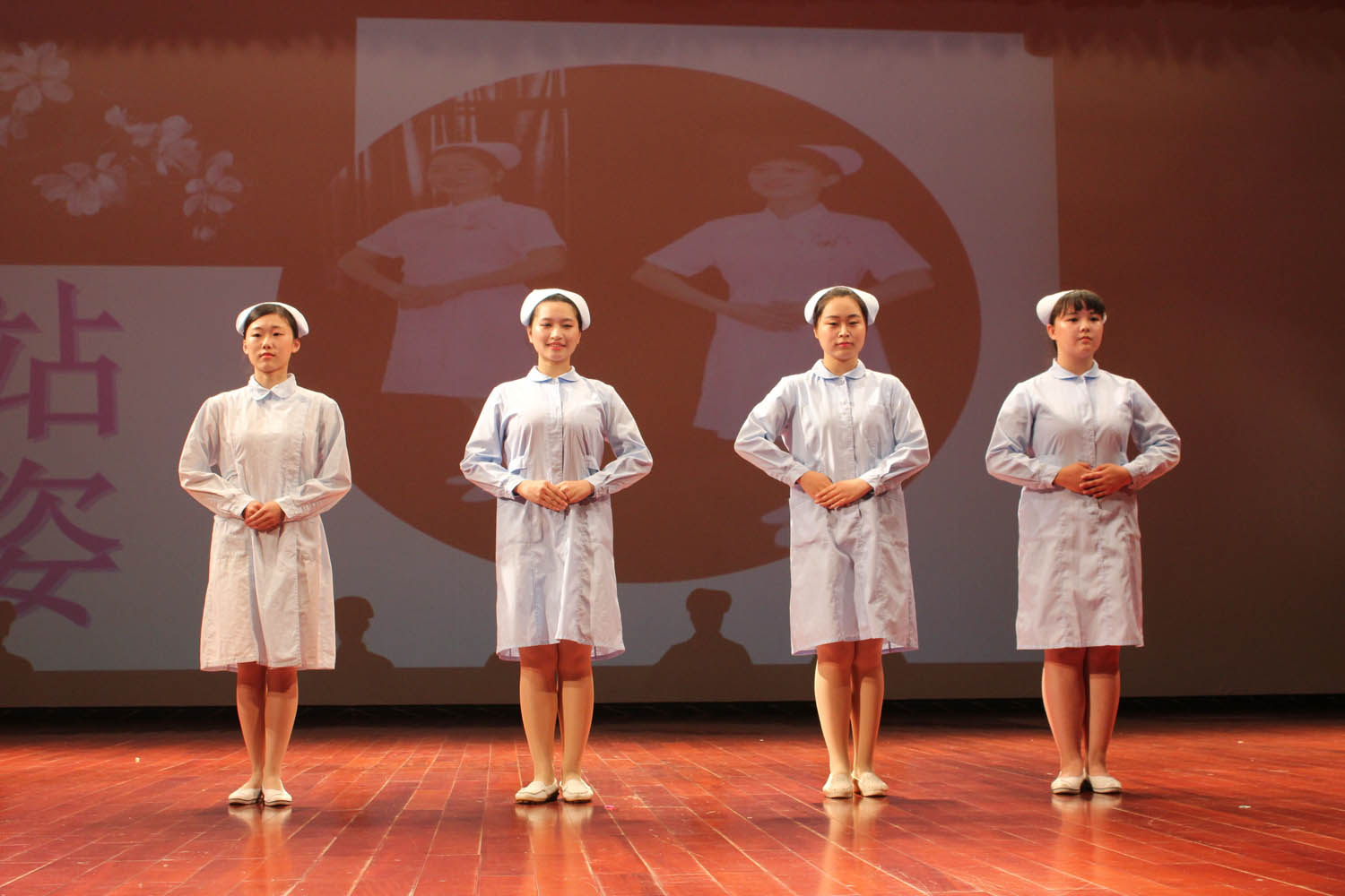 此次礼仪大赛分为服装展示、礼仪展示和情景模拟三个环节进行。服装展示部分最有看点的是环保装,参赛者用废旧报纸、塑料袋、易拉罐等精心制成可爱华丽的服装,吸引了台下观众的眼球。同学们还为观众们带来具有民族风情的藏服,洁白飘逸的哈达述说着他们对故乡的思念。礼仪展示环节中六个班级分别进行护理操作展示,标准规范的站姿、坐姿、推治疗车、托治疗盘等护理基础操作一一展现。在众多表演中最有趣并且富有新意的是将七步洗手法编制成的极富动感的洗手舞以及手语表演,每个动作都透露出礼仪之美。小品环节中每支队伍以不同的故事剧情演绎出医院工作场景。在表演中同学所扮演的护士表现出了作为医护人员所应该具备的宽容,做到了理解病人的冲动和忧愁,并为她们排忧解难。更有同学在小品表演的最后大声朗读医学生誓言,宣誓出自己对医学的执着与坚定。