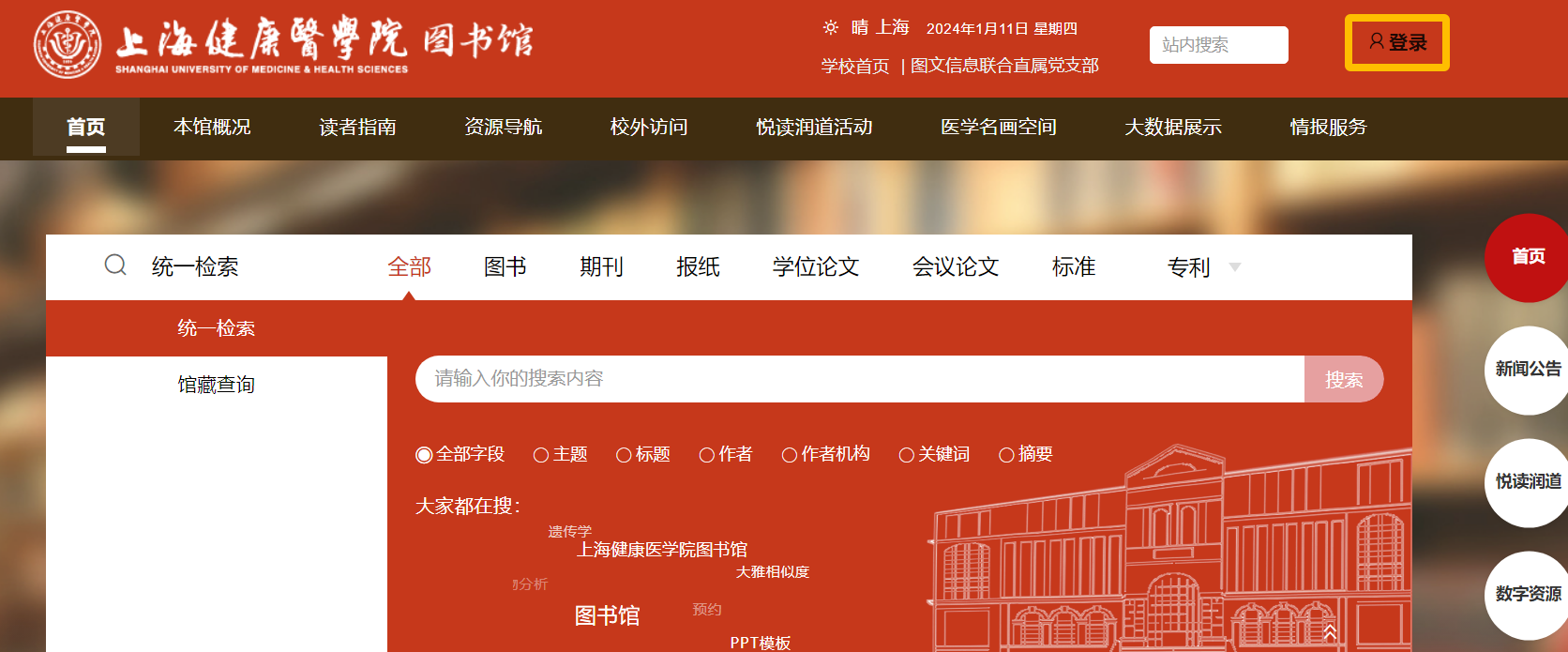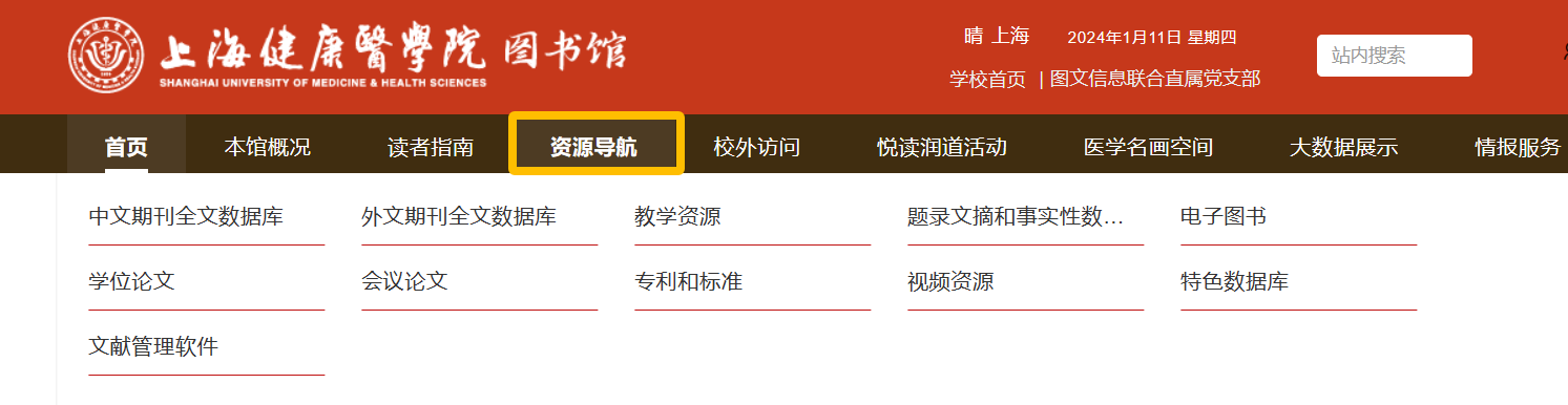 1. 登录上海健康医学院图书馆主页(https://lib.sumhs.edu.cn/),点击右上角“登录”,完成统一身份认证,可通过“资源导航”或“数字资源”,直接访问各类数字资源(镜像数据库仅限校内访问)