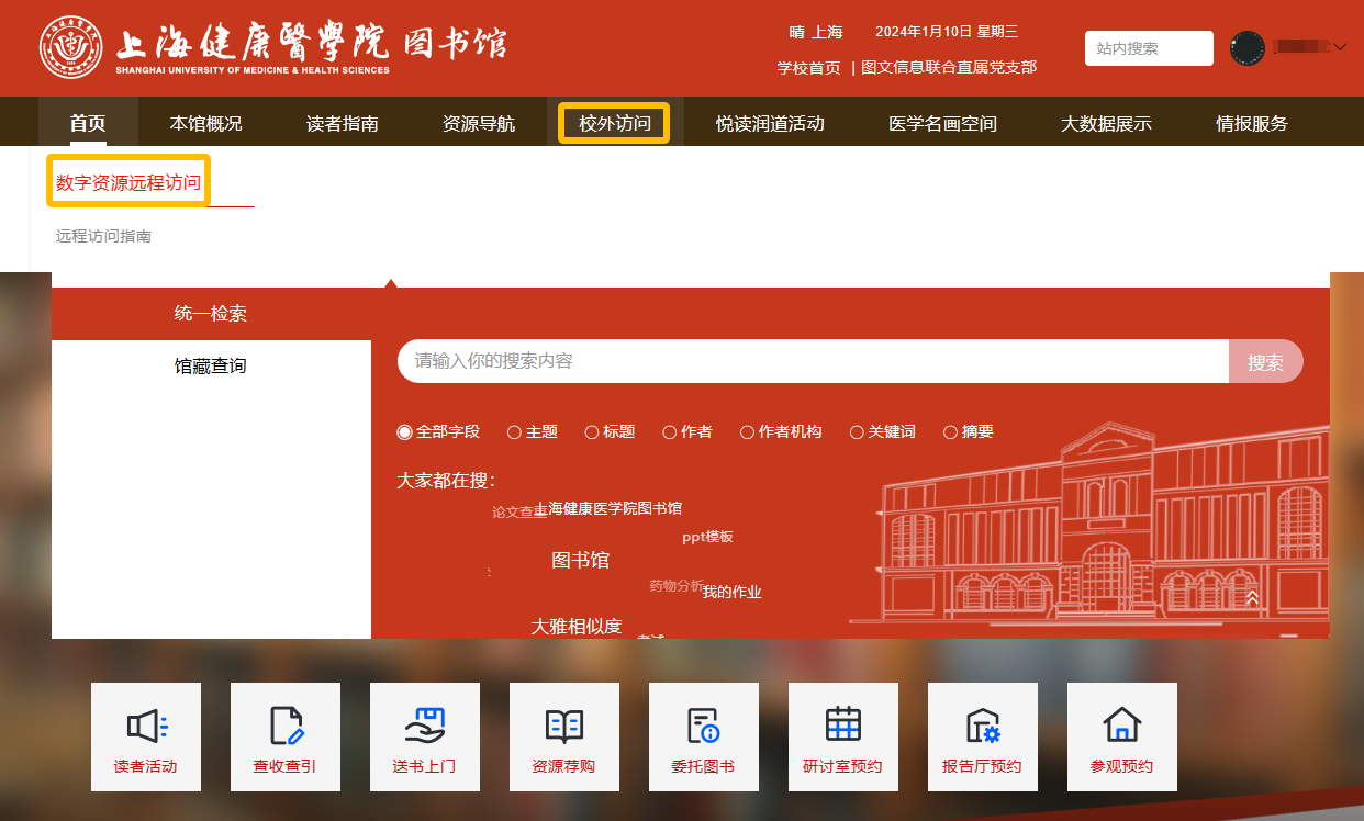 2.  登录上海健康医学院图书馆主页(https://lib.sumhs.edu.cn/),导航栏点击“校外访问”“数字资源远程访问”,可直接进入远程访问系统登录界面,具体可参考站内《远程访问指南》。