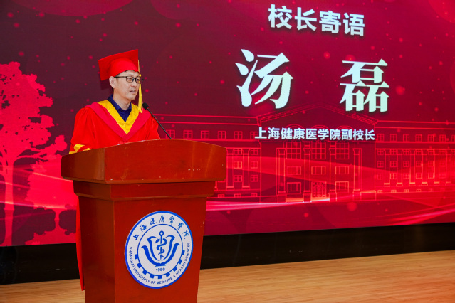 最后,汤磊为同学们送上毕业祝福和美好期许!他代表学校向毕业生们表示热烈祝贺;对尽心竭力、教书育人的老师们表示感谢;对于默默支持的家人们表示敬意!他赞扬同学们在大上海保卫战中最美逆行,敬佩同学们工作学习两手抓、两手硬。汤磊以习近平总书记寄语青年在新时代、新赛道上跑出加速度为指引,鼓励大家贯彻落实习近平新时代中国特色社会主义思想,不负韶华,不负时代,不负人民。他嘱咐同学们,正青春——青年要恪守岗位奉献,助力健康中国“扬帆”;护健康——青年要勇担复兴重任,推进健康中国“破浪”;启新程——青年要坚持终身学习,守护健康中国“远航”。他勉励同学们,要坚持时不我待的拼搏精神,要守住“厚德至善”的健康之训,要勇担“健行康民”的时代重任,不忘初心,砥砺前行!
