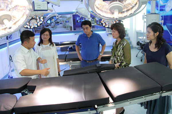 医疗器械学院拥有多个中央财政共建实训基地、上海市公共实训基地、企业共建实训基地等。唐副校长一行首先实地考察了医疗器械学院的模拟手术室及ICU、手术与急救实训室、“诺诚”校企合作实训基地、德国“百合”亚太创新中心、GMP药剂设备实训室等,对医疗器械学院的实验实训环境与条件有了直观地认识。