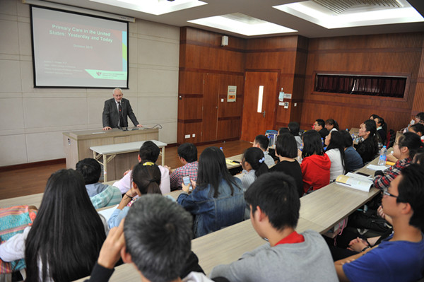 二位专家的讲座主题分别为‘Primary Care in the United States: Yesterday and Today’和 ‘Why Primary Care? Leading Transformation: Patient Safety/Continuity of Care’。讲座在初级医疗体系建设、人才培养目标、人才培养效益等方面为师生回顾了美国发展历程,为中国未来初级医疗保健模式建立提供了值得思考的借鉴。专家们通过美国基本医疗的一般情况,并以国民健康状态、基层医疗质量、分级医疗系统建设等指标为例对比了各发达国家的医疗服务效益,分析了初级医疗惠及状态,并引出了美国的医师培养制度和UNMC的相关课程情况。讲座以大量图文详细描述了初级医疗服务的特点、内涵和外延,并在讲座中贯穿始终的强调了初级医疗服务的延续性发展趋势、以人为本的健康维护观念。