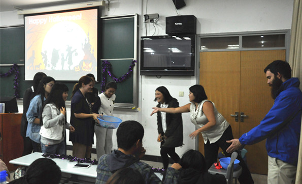 本次活动派出了由6名美籍教师组成的强大阵容,吸引了来自全校各学院150多名的同学参与其中,讲解、游戏、互动,妙趣横生。此次活动适逢西方节日—万圣节,外籍教师诠释了节日的来由和意义,讲解万圣节里的主要元素,并预备了糖果与同学们分享。虽然当晚气温骤降,但现场气氛却非常热烈。