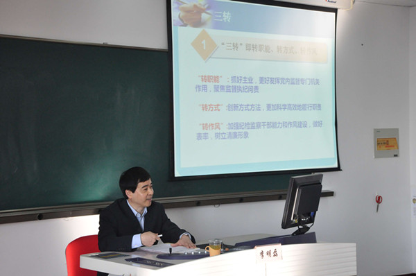 校党委副书记、纪委书记李明磊作了题为《新时期新形势下纪检监察干部的责任和担当》的主题报告。他通过对“一二三四五”的讲解即建设一支过硬素质的纪检监察干部队伍、学习二个法规(《中国共产党廉洁自律准则》和《中国共产党纪律处分条例》)、实现纪检监察工作的“三转”(转职能、转方式、转作风)、把握四种形态(勤浇树、正歪树、治病树、拔烂树)和强化五个意识(忠诚意识、党章意识、纪律意识、担当意识、表率意识),深入浅出的为培训班成员作了一次辅导讲座。