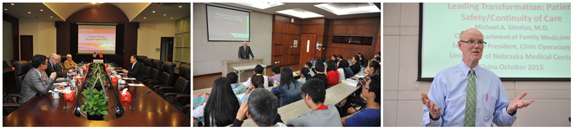二位专家的讲座主题分别为‘Primary Care in the United States: Yesterday and Today’和‘Why Primary Care? Leading Transformation: Patient Safety/Continuity of Care’。讲座在初级医疗体系建设、人才培养目标、人才培养效益等方面为师生回顾了美国发展历程,为中国未来初级医疗保健模式建立提供了值得思考的借鉴。专家们通过美国基本医疗的一般情况,并以国民健康状态、基层医疗质量、分级医疗系统建设等指标为例对比了各发达国家的医疗服务效益,分析了初级医疗惠及状态,并引出了美国的医师培养制度和UNMC的相关课程情况。讲座以大量图文详细描述了初级医疗服务的特点、内涵和外延,并在讲座中贯穿始终的强调了初级医疗服务的延续性发展趋势、以人为本的健康维护观念。