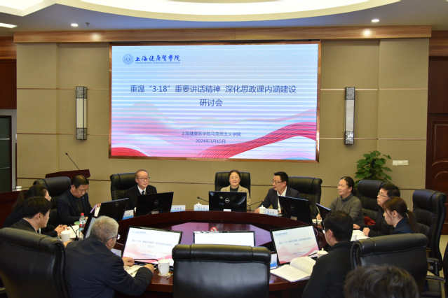 3月15日,在习近平总书记主持召开学校思想政治理论课教师座谈会五周年之际,为深化习近平总书记“3·18”重要讲话精神学习,推动新时代高校思政课高质量发展,上海健康医学院举办“重温‘3·18’重要讲话精神 深化思政课内涵建设”研讨会。上海健康医学院党委书记郭永瑾、上海交通大学讲席教授陈锡喜、上海市澧溪中学党支部书记张旭平、上海市疾病预防控制中心吴悦参加本次研讨会。上海健康医学院马克思主义学院全体教师、学生代表等参加会议。研讨会由上海健康医学院马克思主义学院院长李兆伟主持。