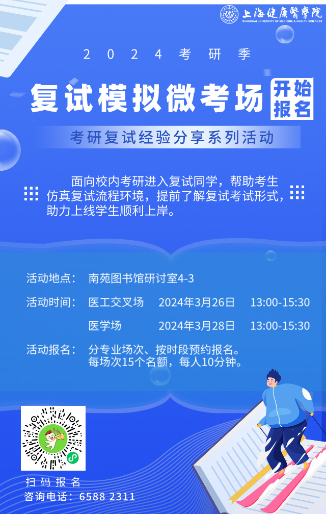 “复试模拟微考场”由研究生管理办公室、研究生直属党支部举办,为本年度考研复试经验分享系列活动之一。该活动面向校内报考医工交叉及医学类相关专业进入复试同学,帮助考生仿真复试流程环境,提前了解复试考试形式,助力上线学生顺利上岸。具体活动安排通知如下: