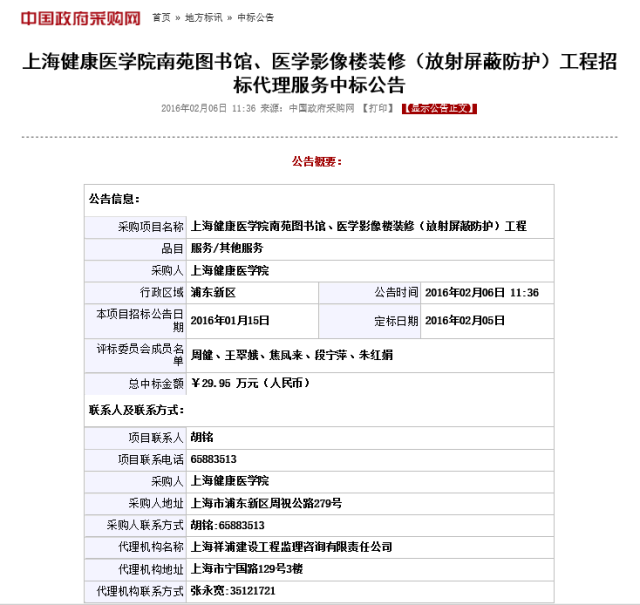 上海健康医学院南苑图书馆、医学影像楼装修(放射屏蔽防护)工程招标代理服务中标公告