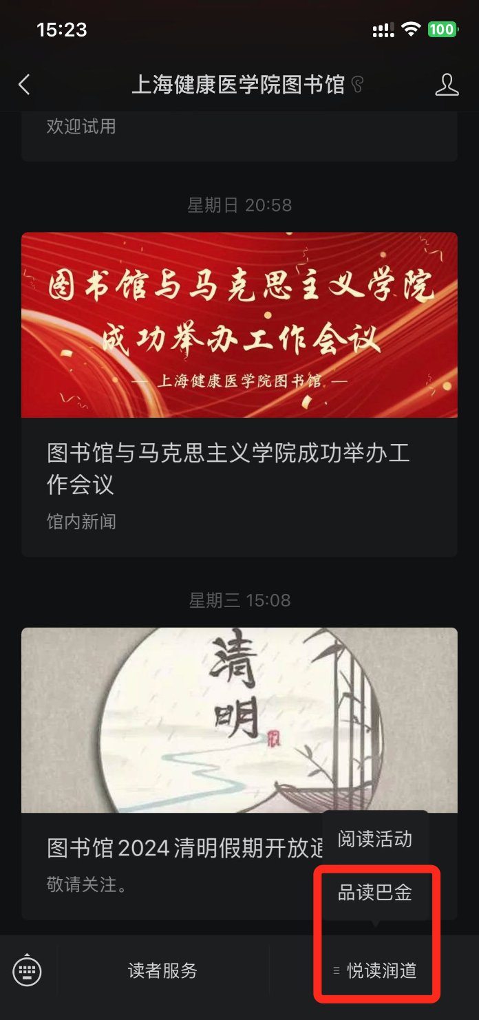 首页切换为“上海健康医学院图书馆”,点击顶部“品读巴金”活动轮播横幅;