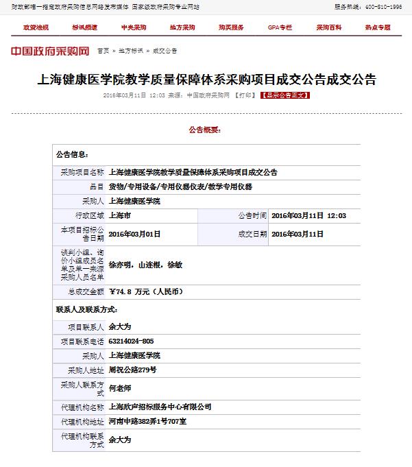 上海健康医学院教学质量保障体系采购项目成交公告成交公告
