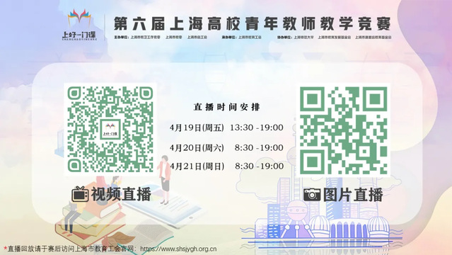 第六届上海高校青年教师教学竞赛于4月19日—21日举行。我校八位教师将参加人文科学、社会科学、思想政治理论课专项、自然科学基础学科、医学学科共5个组别的比赛,欢迎全校教师通过微信视频直播号收看现场直播,共祝他们取得好成绩!