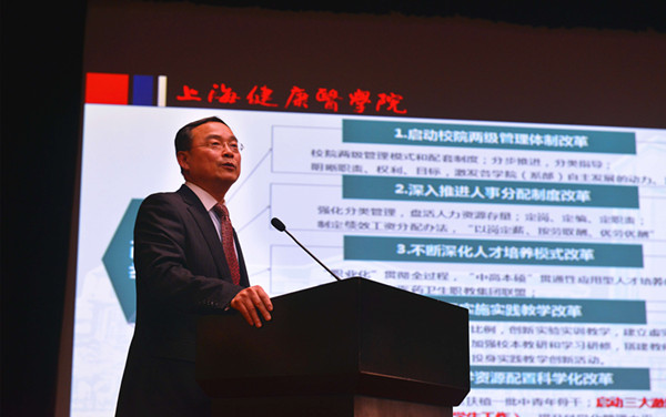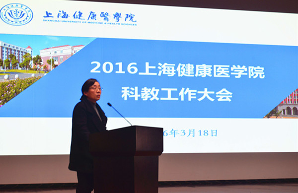 3月18日下午,我校2016年科教工作大会在浦东校区400人报告厅隆重举行。校党委书记郑沈芳出席会议并讲话。校长黄钢作工作报告。副校长于莹主持会议。学校党政领导李明磊、曹蓉蓉、唐红梅、张道方出席大会。全体科级及以上干部、教师代表、各附属医院主要领导齐聚一堂,共同分享2015年我校在医教研方面取得的累累硕果。