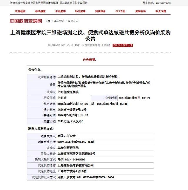 上海健康医学院三维磁场测定仪、便携式单边核磁共振分析仪询价采购公告