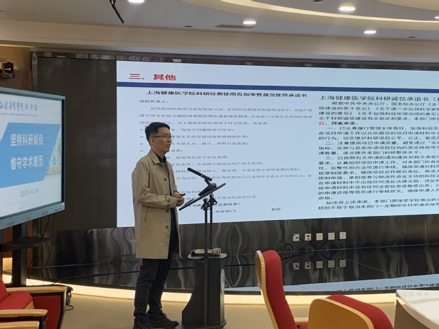 科研诚信是学术发展的基石,为落实学校年度教职工政治理论学习暨育德能力提升培训工作,2024年4月29日下午,药学院举办“坚持科研诚信,恪守学术规范”专题讲座。会议邀请了复旦大学附属华山医院团委书记、上海市科研诚信宣讲团专家组成员茅善华博士和上海健康医学院科技处孙吉老师作专题讲座,会议由药学院副院长解伟主持。