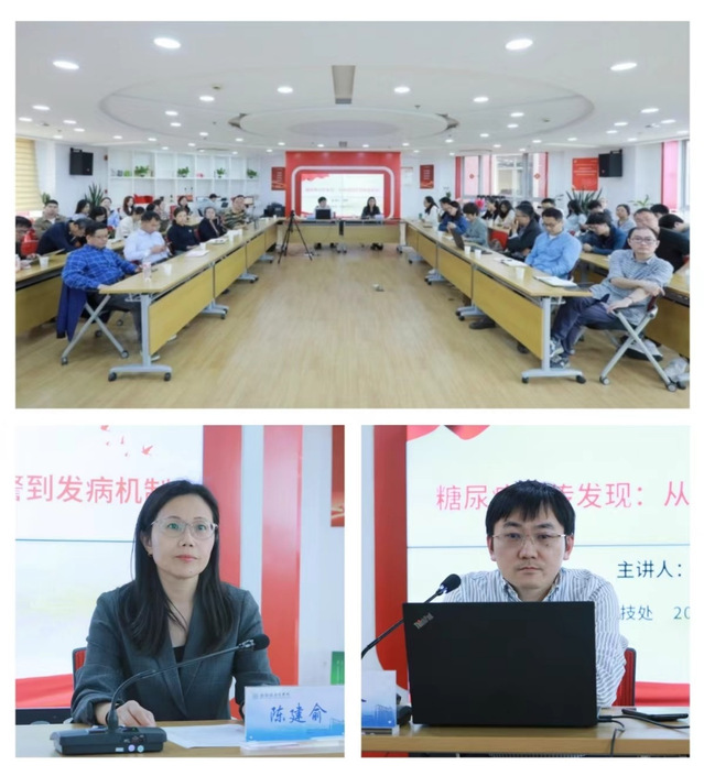 5月9日下午,【健·谈】第2期学术系列讲座在我校北苑顺利举办,本期特邀上海交通大学医学院附属第六人民医院副院长、上海市糖尿病研究所副所长、国家杰出青年科学基金获得者胡承教授作题为“糖尿病遗传发现:从疾病预警到发病机制”的精彩报告。本场讲座由科技处负责人陈建俞主持,学校的教师、科研人员、研究生以及附属医院的医生们近一百人线上线下同步参会。