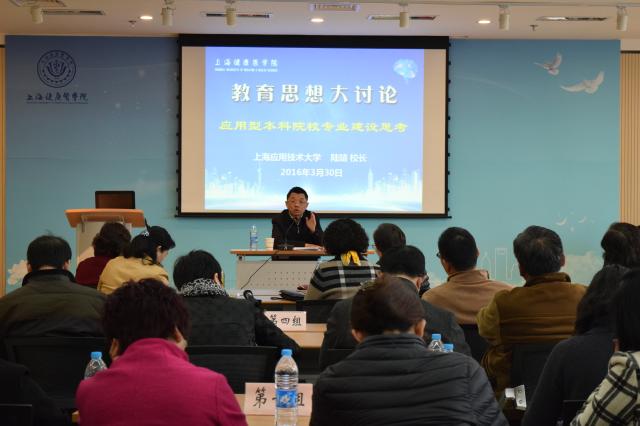3月30日,我校2016年首次教育思想大讨论活动在南苑7号楼403会议室举行,上海应用技术大学校长陆靖应邀作了题为《应用型本科院校专业建设的思考》的主旨报告。校党委书记郑沈芳、各学院院长、专业负责人、教务处及教师发展与教学研究中心老师出席,本次报告由副校长唐红梅主持。