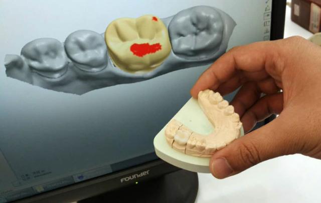 在老师指导下,3D摄像头像压舌板一样伸入口腔30秒,一口气拍下200多张照片,电脑屏幕上即合成为全部齿模。针对其中那颗坏牙,大学生开始根据模板“创作”一颗可以对号入座、天衣无缝的3D牙。“以后就不必先‘吃’印模材料,再制作石膏牙模了。”说话间,虚拟现实的三维牙模已经通过电子邮件发送,只要选择金属或其他各种材料,就可以请假牙制作室把它3D打印出来了。