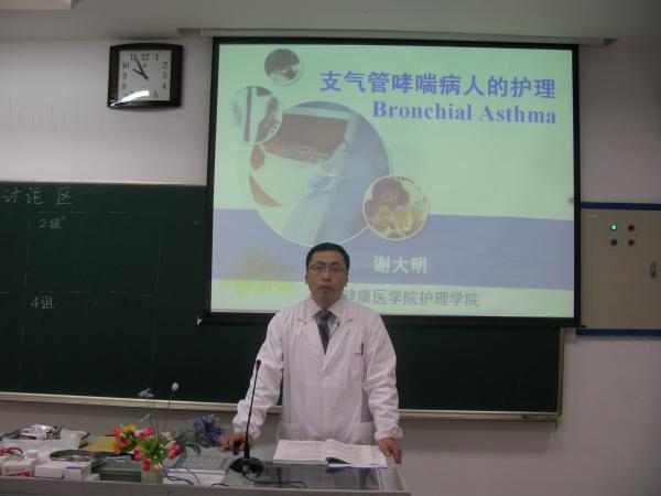 4月6日上午,我校护理学院谢大明老师以“《内科护理学》--支气管哮喘病人的护理”课堂教学,拉开了附属卫生学校教学法评优活动复赛的序幕。市教委“医学组”胡天佐等7位评审专家来到学校,他们首先对谢老师的授课计划、教案和说课稿进行了认真审阅,随后通过现场听课、教师说课与专家提问等环节进行了评审。
