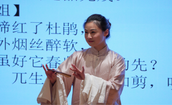 罗老师通过声腔、身段的多重演练,获得了满堂喝彩,台下的师生们都饶有兴致地跟着学比兰花指。罗老师表演了昆曲经典剧目《牡丹亭》的唱段,一声声委婉清丽的古雅“水磨调”,把气氛推向了高潮,实现了与观众的共情和共鸣。