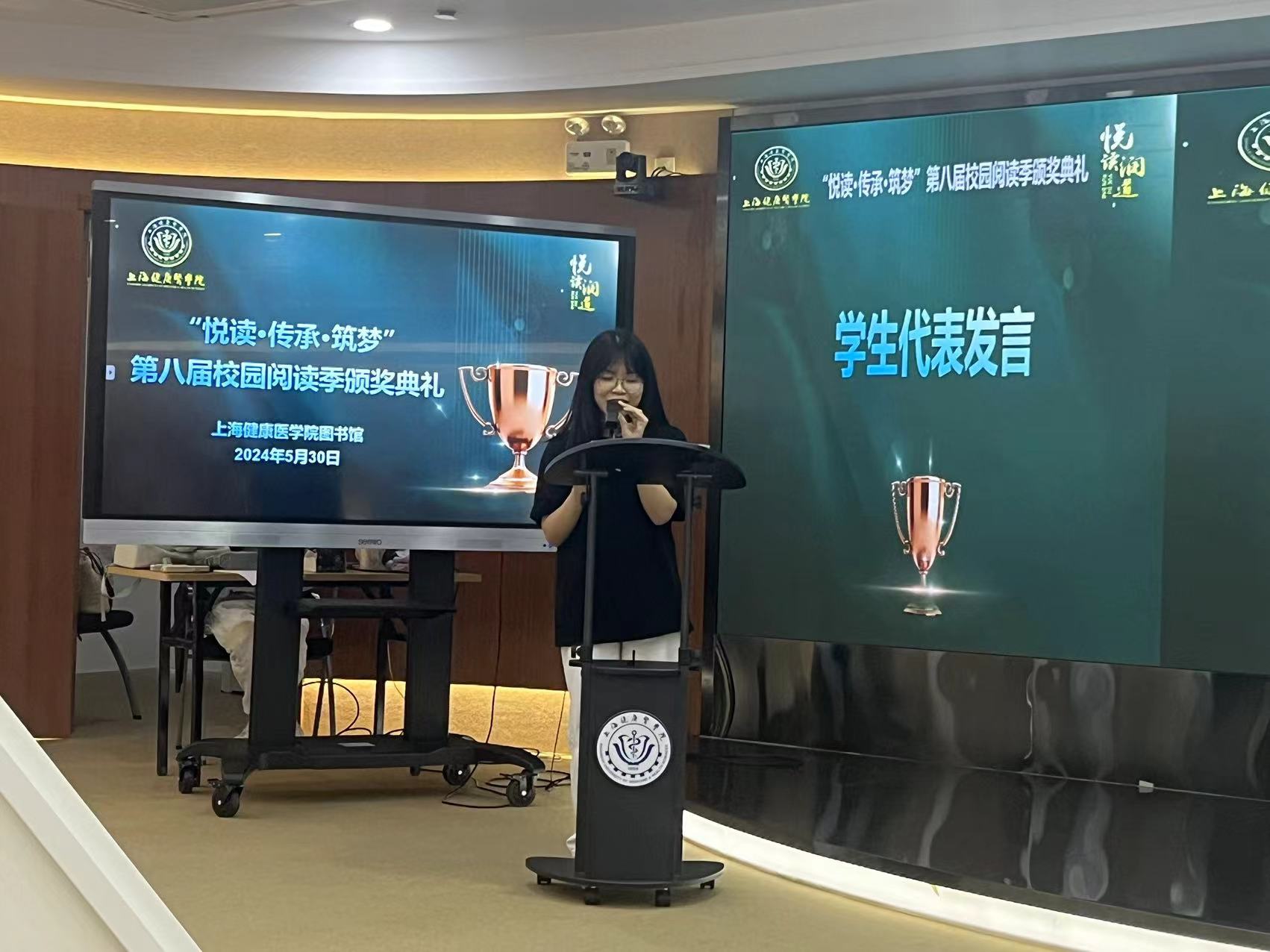5月30日下午,“悦读·传承·筑梦”校园阅读季颁奖典礼在南苑图书馆五楼报告厅举行,上海健康医学院艺术教育中心刘理老师、品墨读书会指导教师曹佼佼老师、图文信息中心副主任柳丽花、获奖代表和亲友团等60余人参加,典礼由郑植和徐昕怡共同主持。